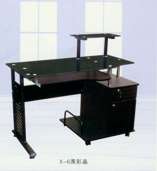 *Configuration: steel frame; Printer or sound boxes glass platform supported by two legs; the whole board put the keyboard and mouse on; one drawer with key and one cabinet, s Special frame putted on host computer; a retractile keyboard platform